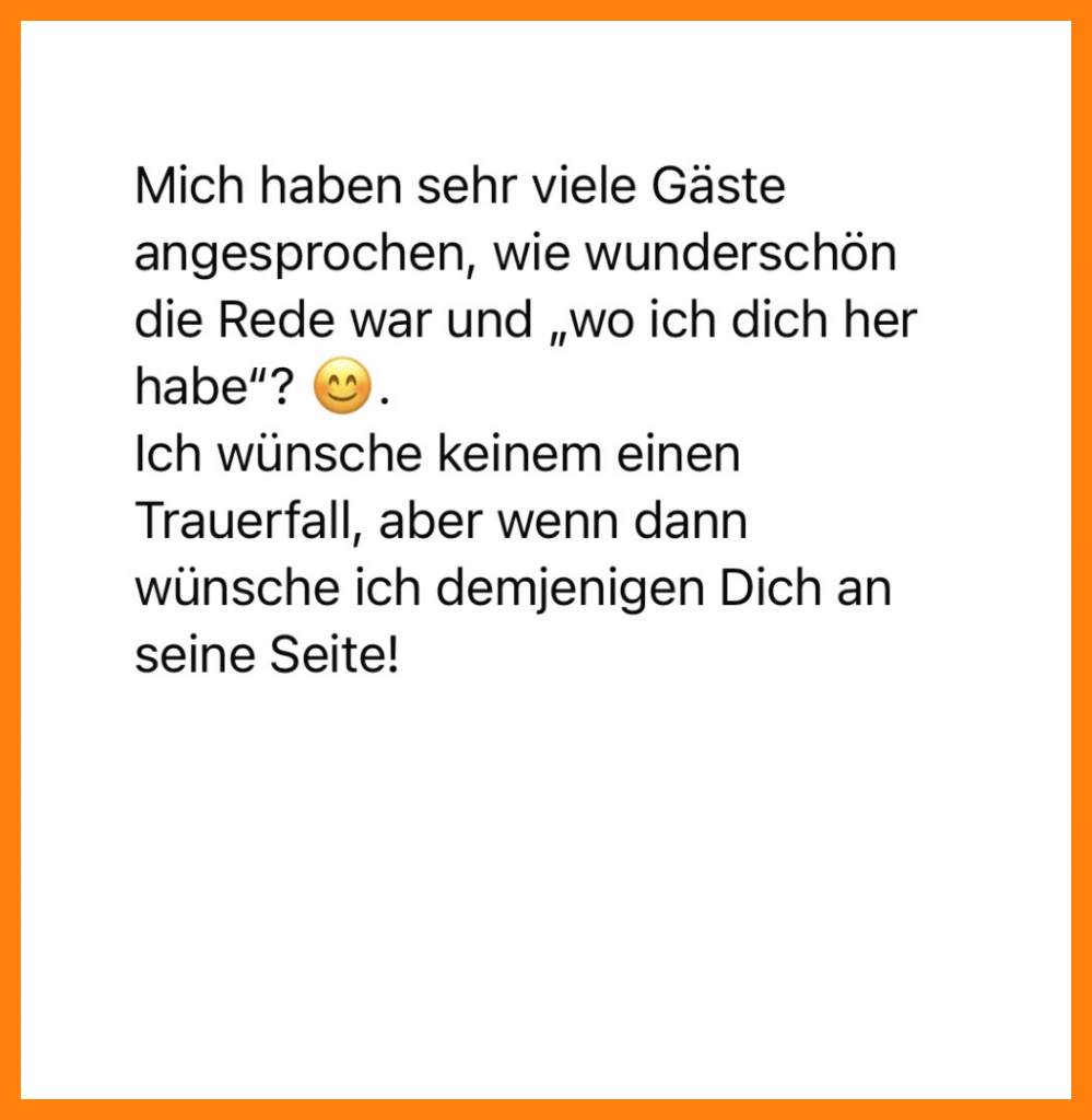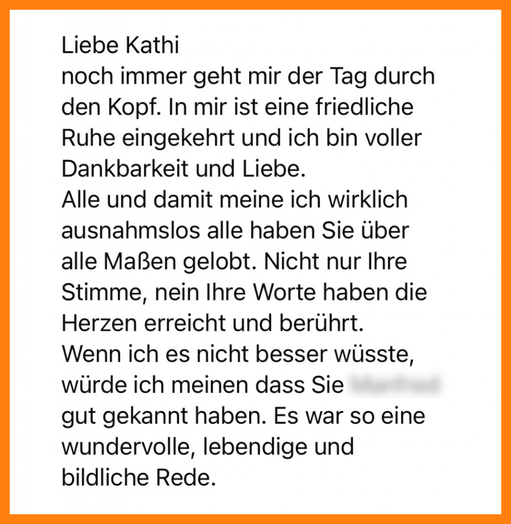 “Es war nicht nur “die Rede”, es war deine Betreuung vom ersten Telefonat an! Obwohl ich ich dich sehr oft kontaktiert habe, hatte ich nie das Gefühl zu stören. Du hast dich mehrmals für das Vertrauen bedankt, dass wir geschenkt haben und ja, mir ist jetzt erst so richtig bewusst, wie sehr ich auf dich vertraut habe! Bei dir ist die Berufung der Beruf und das merkt man!”
