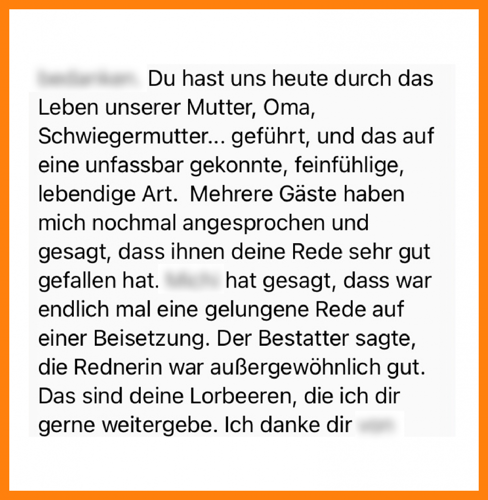 “Beim Vorgespräch haben meine Schwester und ich uns durch ihre einfühlsame und sympathische Art nach kürzester Zeit rundum wohl gefühlt und es wurde nicht nur geweint, sondern auch sehr viel gelacht.”