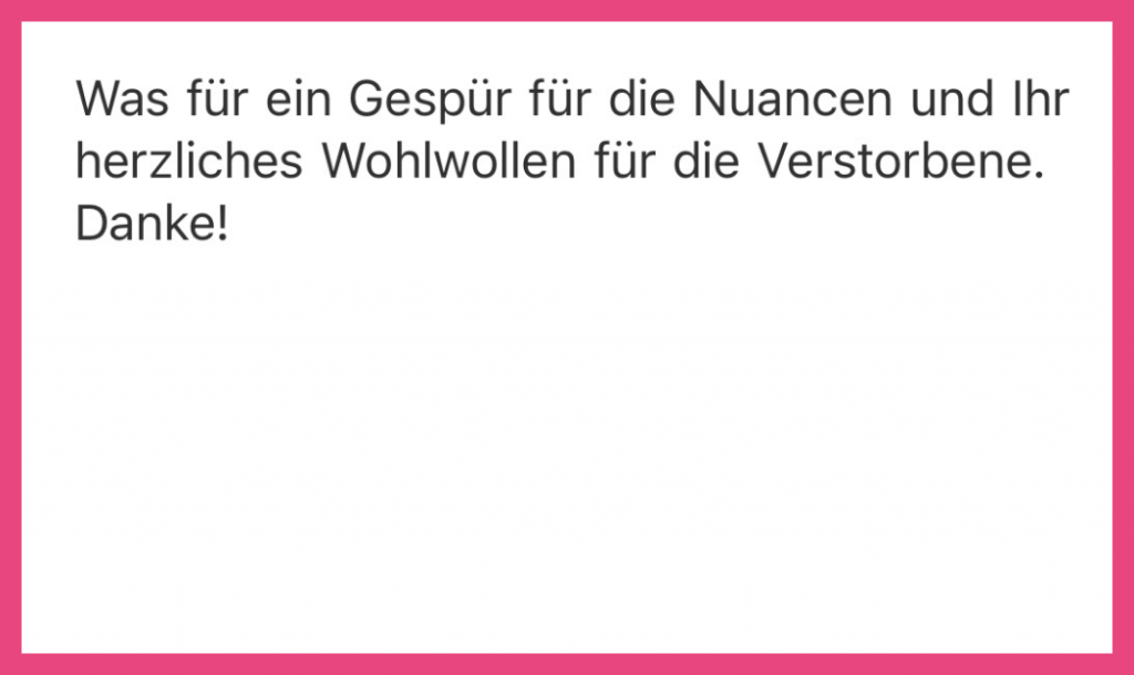 Durch meine Arbeit und das Auseinandersetzen mit Tod & Trauer – als das Natürlichste auf der Welt – habe ich gelernt, dass die Schwere mittlerweile zu einer Sauerstoffflasche geworden ist, die es mir ermöglicht, immer weiter zu tauchen. Mein Ziel: Trauer, Abschied und Tod nicht mehr totzuschweigen und jedem die Unterstützung zu geben, die er benötigt.